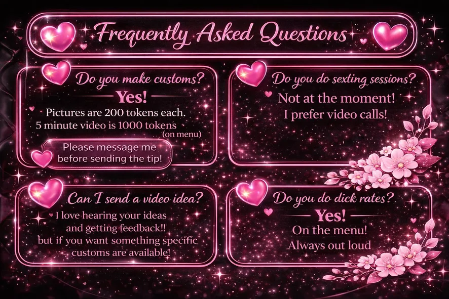 أهيجاو, رقص مثير, تعري, فتيشية القدم, خف الجمل, لعب الأدوار, رقص التعري, كعوب عالية, صدر عارٍ, رقص التويرك, يوغا, كلام بذئ, تصبيع, نيك الصدر, تعليمات الاستمناء, تدليك, العادة السرية, نشوة, صفع, ألعاب جنسية, تقييم الزبر, قضيب صناعي أو هزاز, عاشقات, مص, حلق عميق, فاضح جدًا, إهانة, نطر كساس